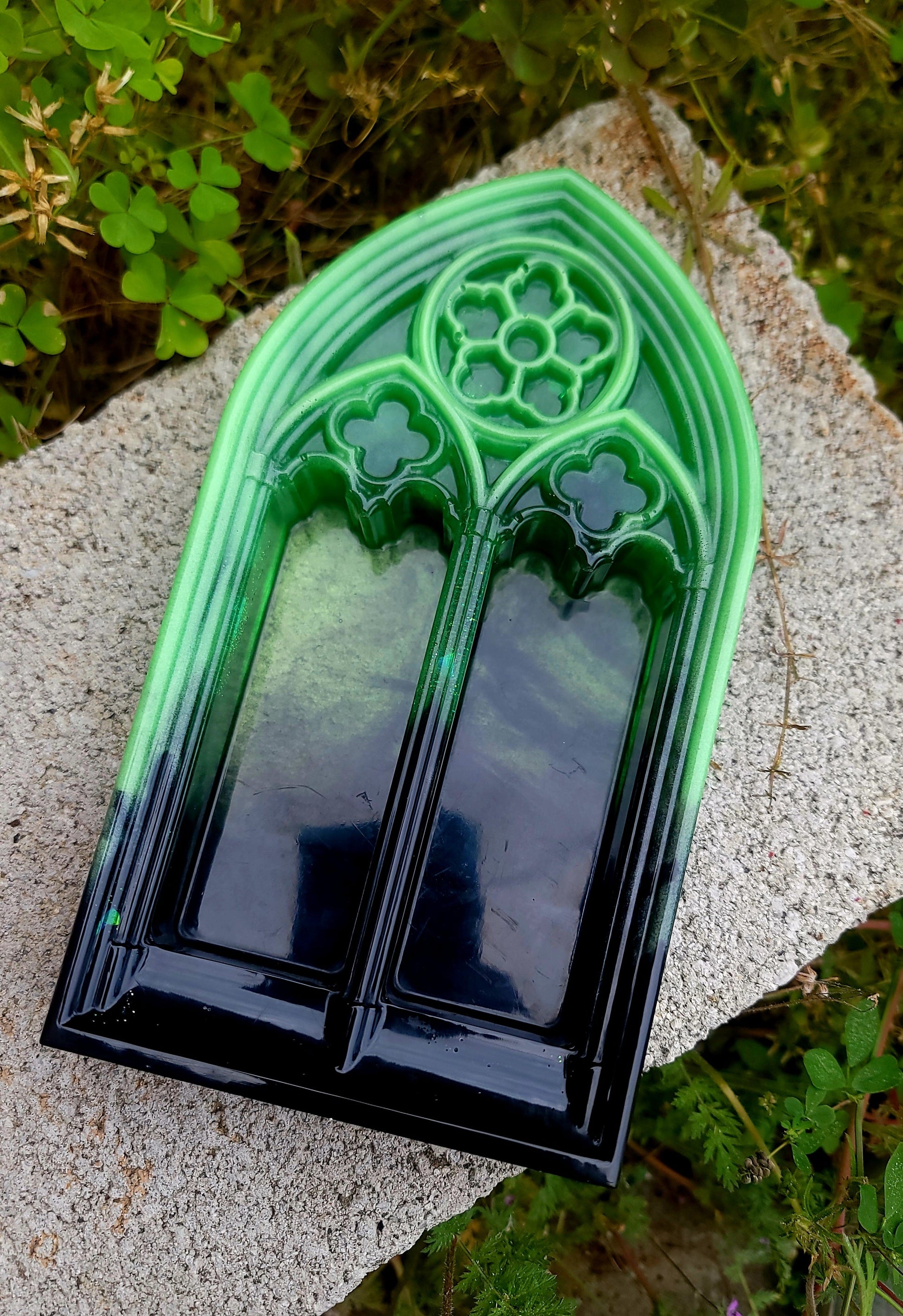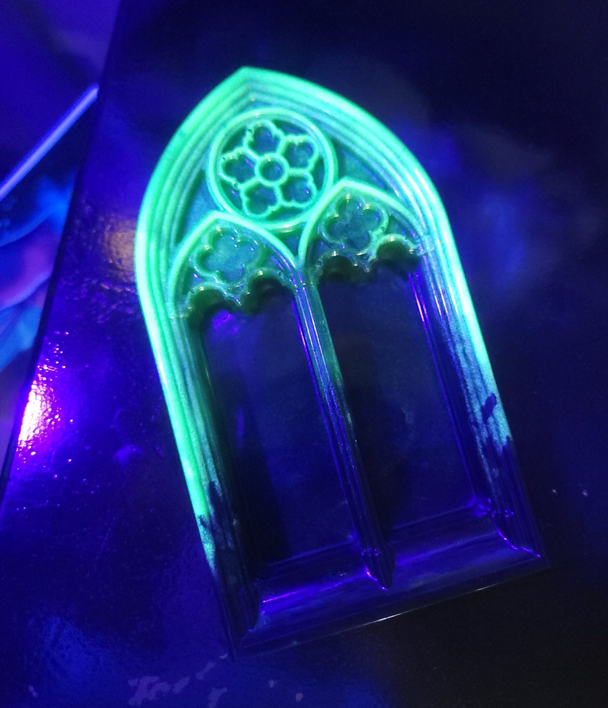 Elevate your home decor with our Handmade Black & Green Cathedral Arch Display! Handcrafted with love and care, this unique piece adds a touch of elegance to any space. Use it as a backdrop for photos, display your favorite trinkets, or let your creativity soar. Upgrade your style with this stunning display today! This cathedral display also shows off a glow in the dark/UV reactive feature!