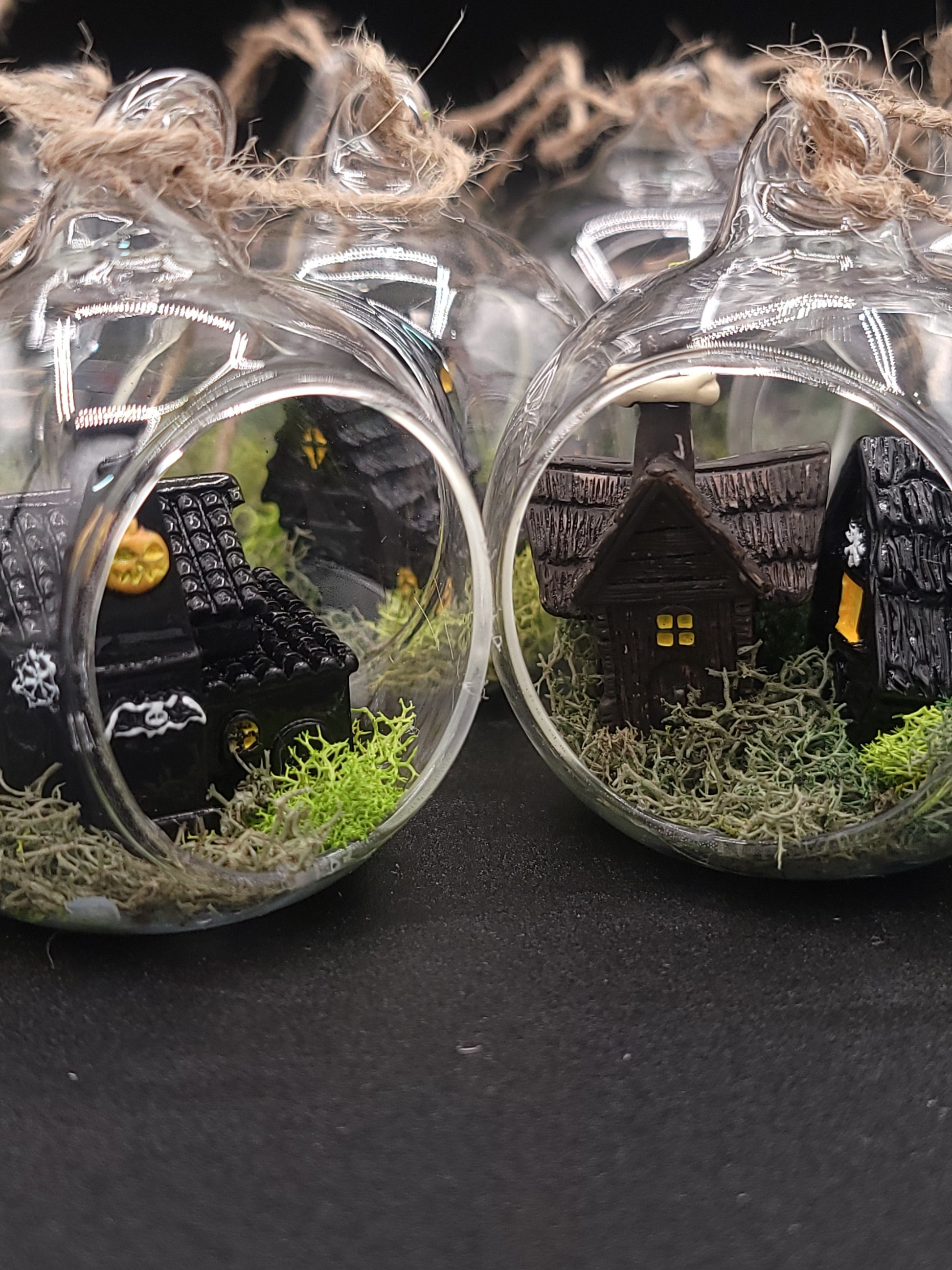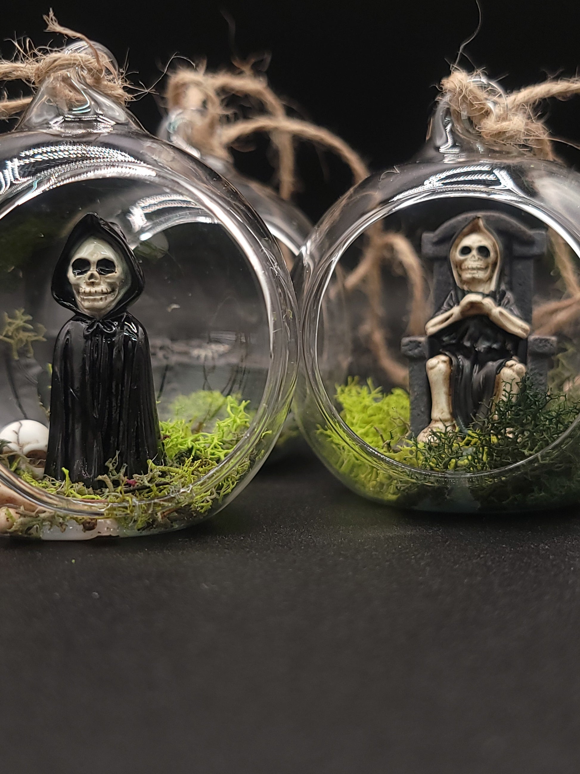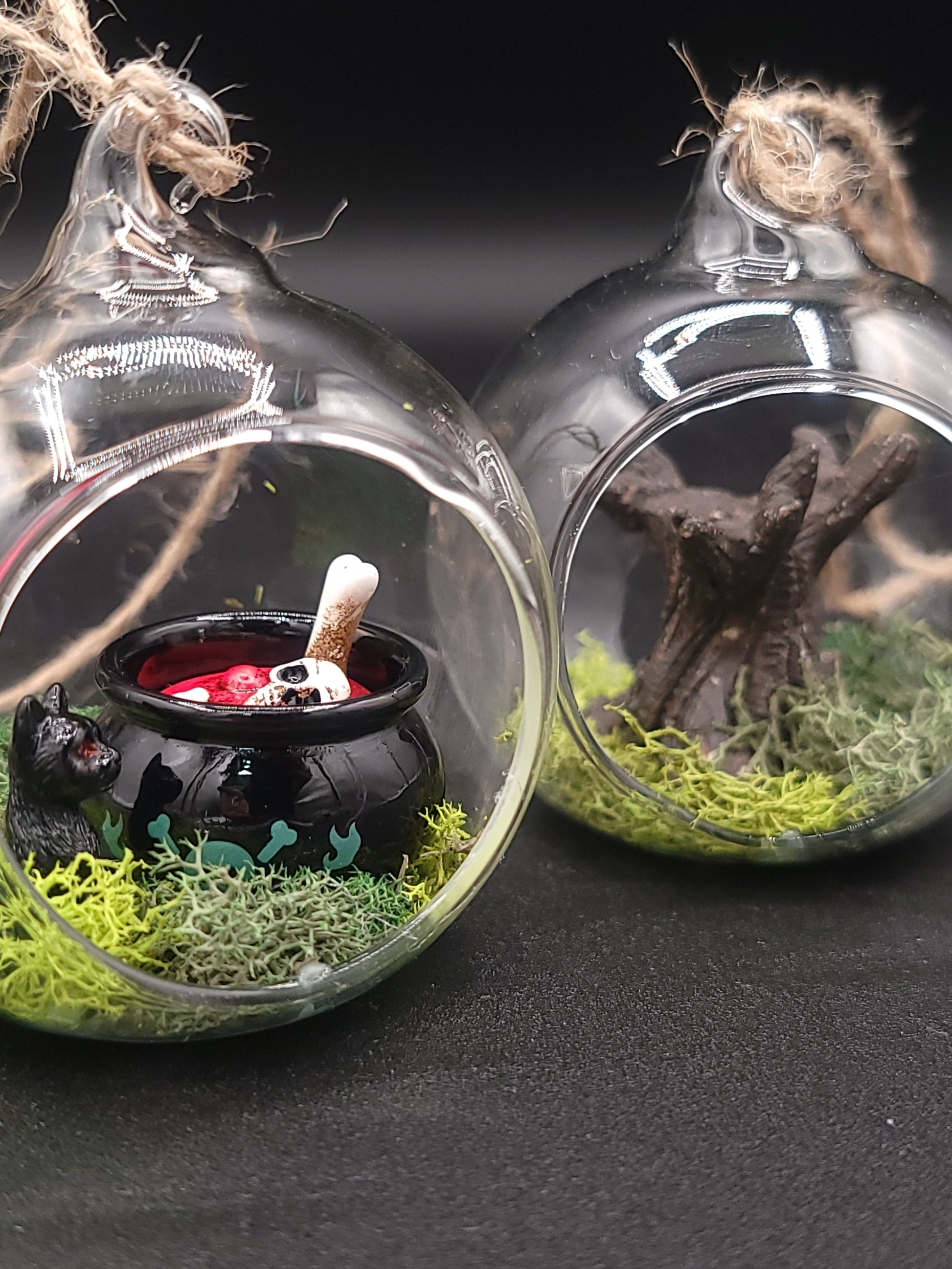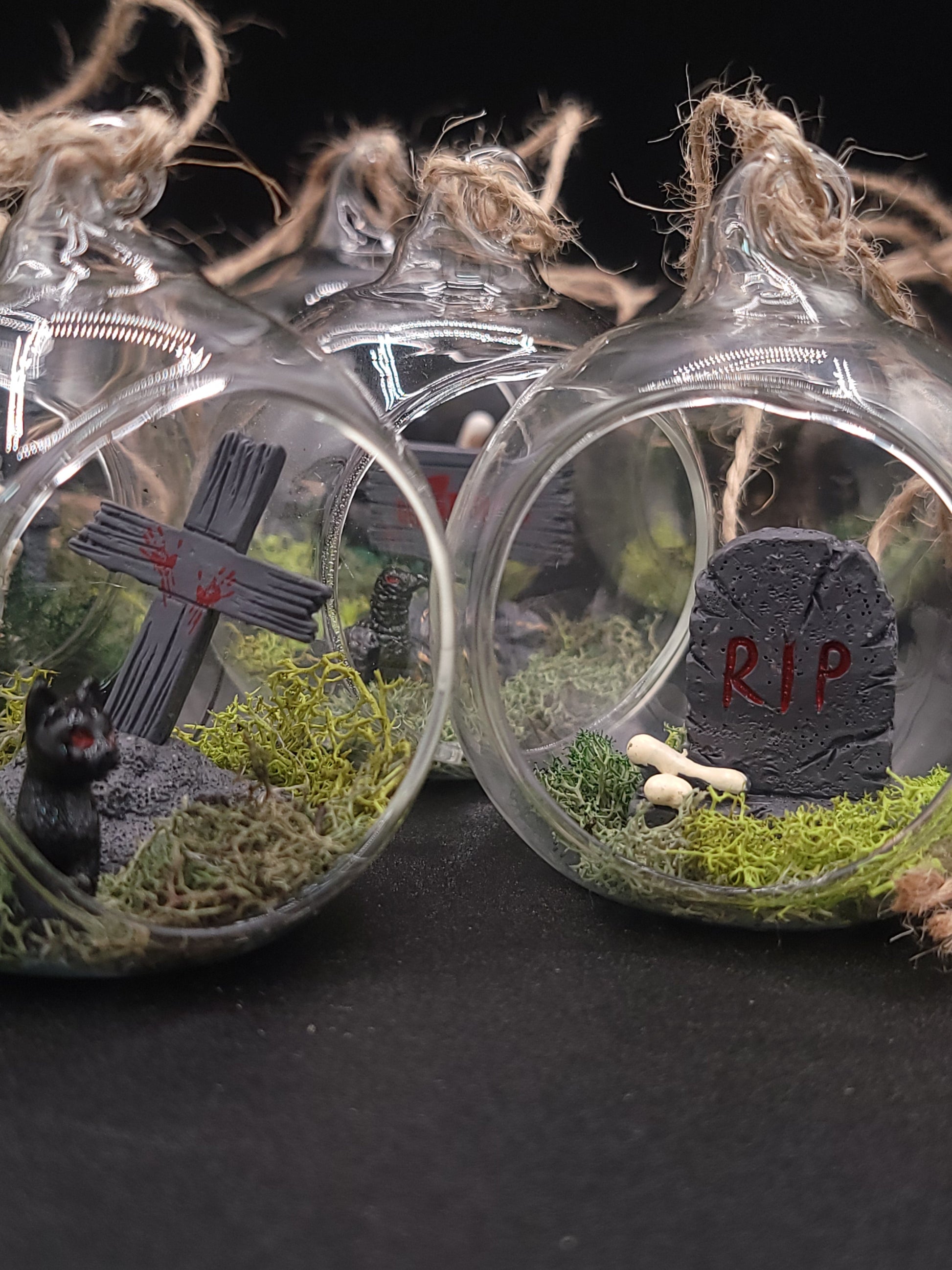 Add a touch of spooky charm with our Creepy Cute Mini Hanging Terrarium. Featuring mini cats, coffins, tombstones, skulls, cauldron, haunted houses, grim reaper, and creepy trees, this terrarium is sure to inspire a fun and eerie atmosphere. Perfect for Halloween or year-round decoration.